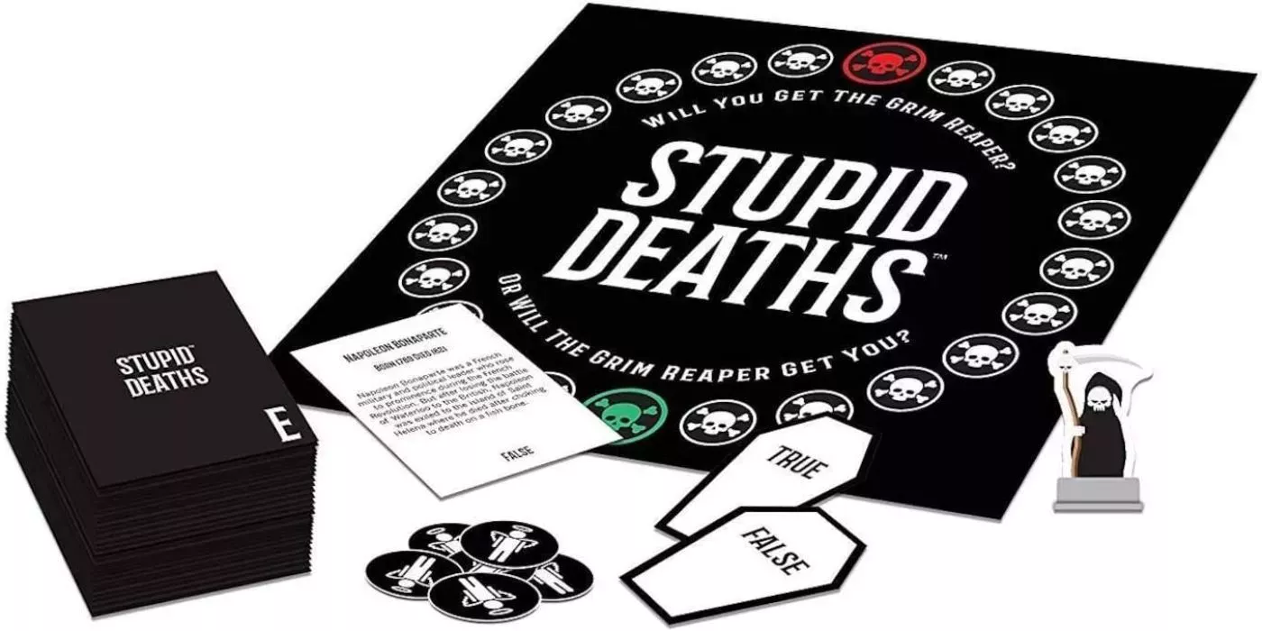 Cualquier jugador que se equivoque debe mover la pieza de la Parca un espacio hacia la suya. Si la Parca toca a un jugador, éste perece pero puede usar una ficha de vida para ganar otro intento. Para los que no les importe el sentido del humor negro, Muertes estúpidas promete un rato verdaderamente escandaloso.