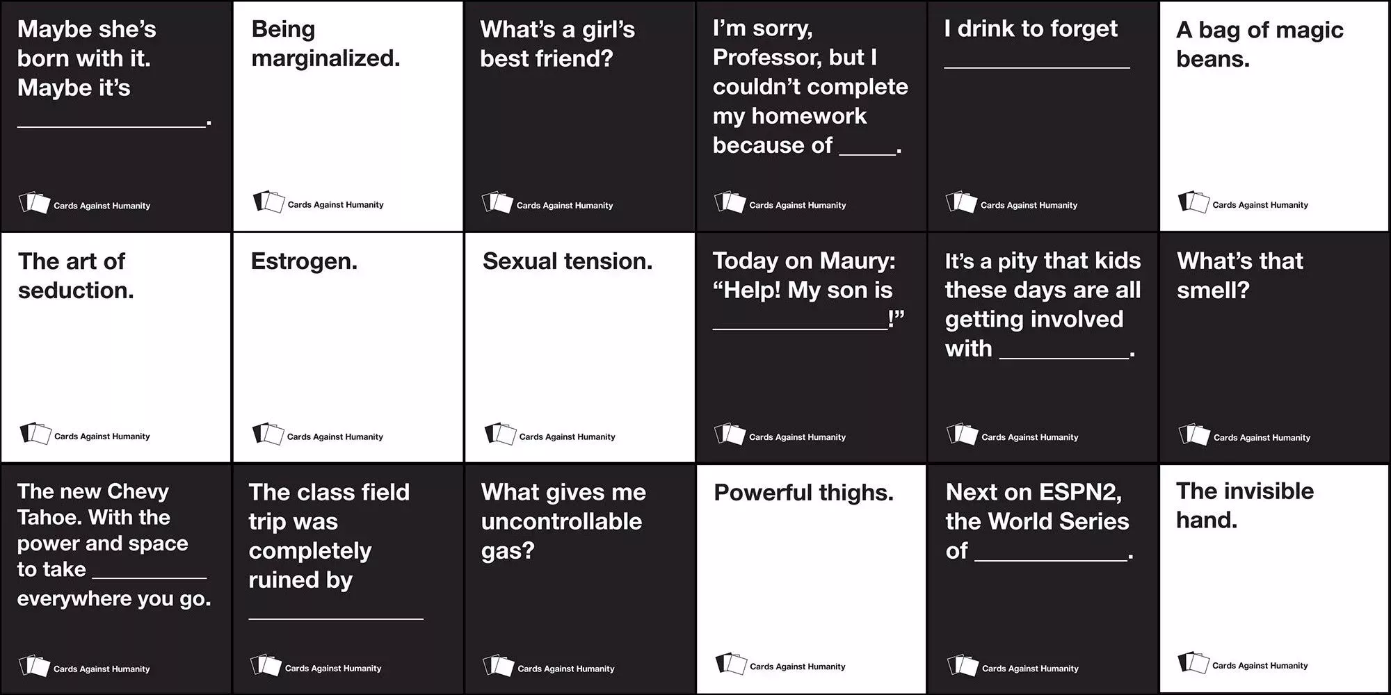 Cards Against Humanity , y todas sus expansiones, sigue siendo uno de los mejores juegos que provocan carcajadas. Los jugadores dan la vuelta a una carta que revela una frase con uno o más espacios en blanco. A continuación, los jugadores seleccionan por turnos una carta de su mano para rellenar ese espacio en blanco. El jugador que da la vuelta a la carta de sugerencia elige la respuesta que considera mejor.
