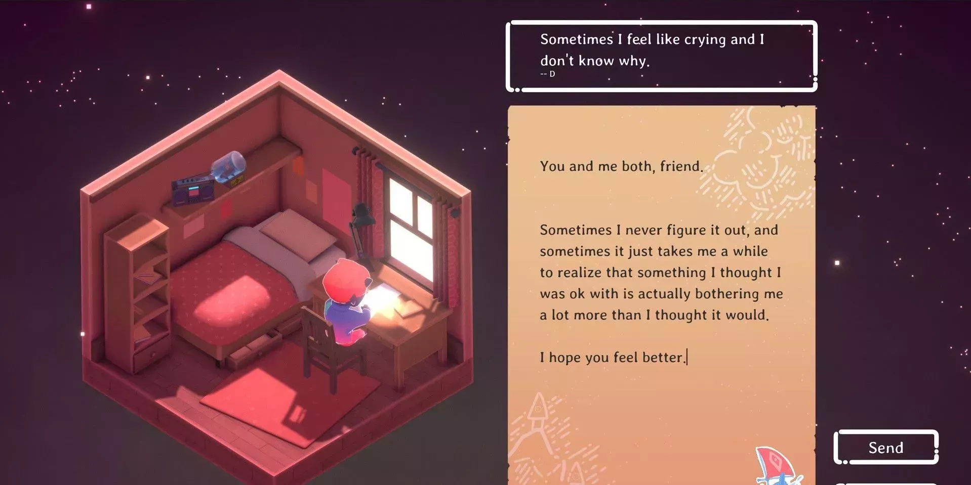 Si el propósito de un jugador para 2023 es ser más amable con los demás y comunicarse más, puede echarle un vistazo a Kind Words, de Popcannibal. Este acogedor juego para PC se desarrolla en una cómoda habitación en la que el jugador se sienta en su escritorio y se preocupa por los demás escribiéndoles cartas.