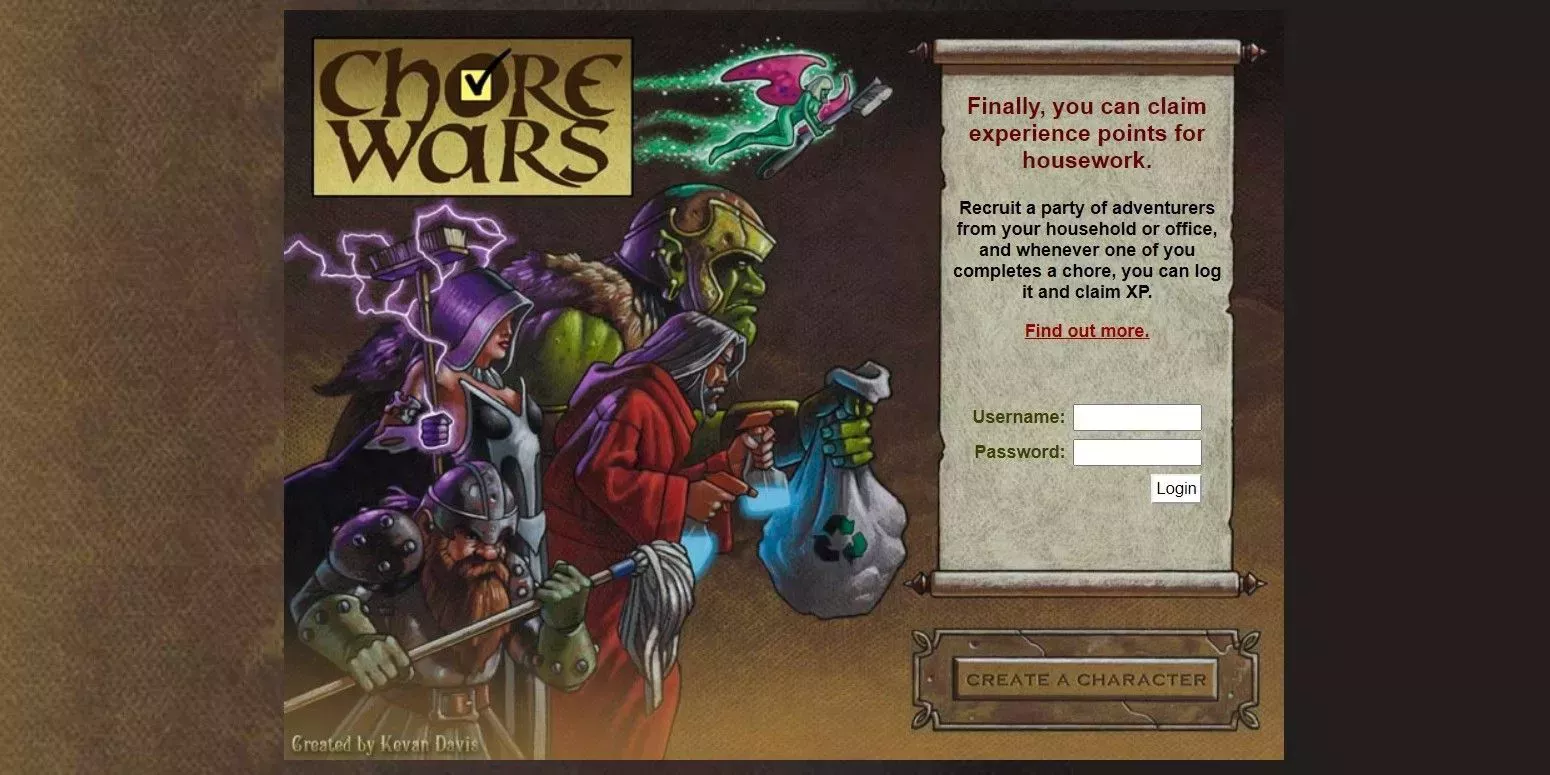 Chore Wars es un juego ideal para quienes desean ser más productivos en casa, pero suelen pasar la mayor parte del tiempo deseando ser aventureros en un reino de fantasía. Los jugadores pueden unirse y convertirse en un grupo de aventureros, todos con el objetivo común de seguir la pista de las tareas necesarias y cumplirlas.