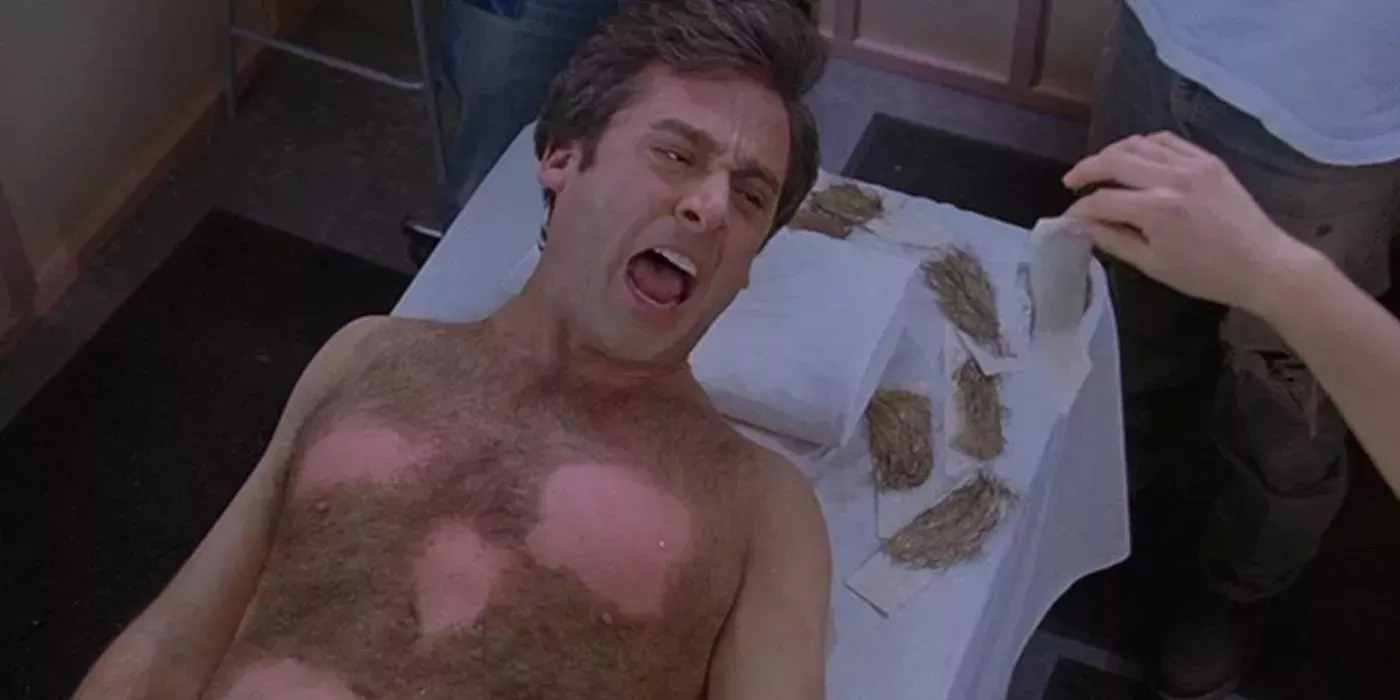 En la divertidísima escena de depilación del pecho de 40 Year Old Virgin, el vello del pecho es todo de Carell, al igual que sus gritos, y la sangre que se forma después de que el vello haya sido rápidamente arrancado. Es una de las escenas más divertidas de una película que está absolutamente repleta de ellas. Incluso el propio Steve Carrell diría seguramente que el dolor ha merecido la pena.