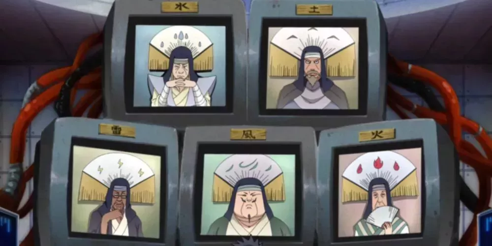En el mundo shinobi, el Kage funciona como lÃder militar de una Aldea Oculta, mientras que el daimyo sirve como su figura polÃtica. Estos lÃderes trabajan junto con equipos de asesores, un consejo de ancianos y ayudas extranjeras para tomar decisiones ejecutivas sobre su paÃs.