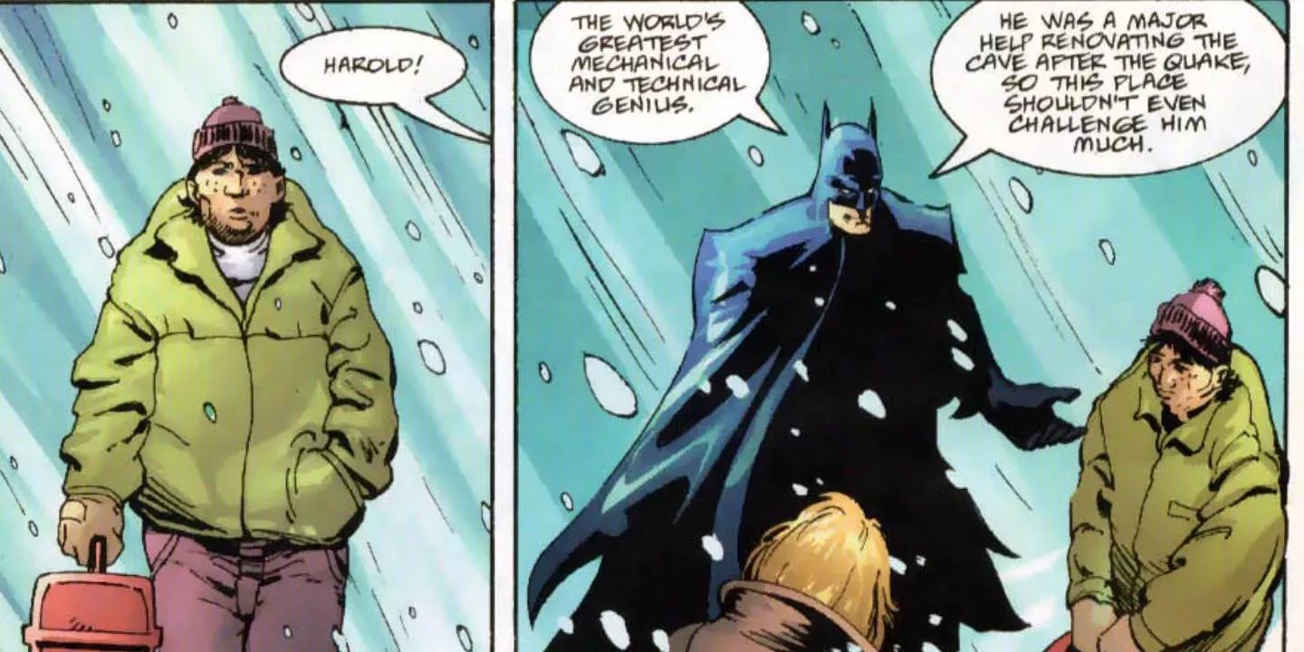 La última vez que Azrael se encontró con Harold fue durante Batman: Knightquest, y según él mismo admitió, fue bastante cruel con Harold, usando sus inventos pero sin darle las gracias ni elogiarle. Así, sabiendo que Harold estaba sin trabajo desde que ayudó a reparar la Batcueva, Azrael le permitió quedarse con él en Ossaville, dándole un hogar en la ciudad, y Harold le mostró su agradecimiento construyendo nuevos artilugios para que el Ángel Vengador los usara en su cruzada.