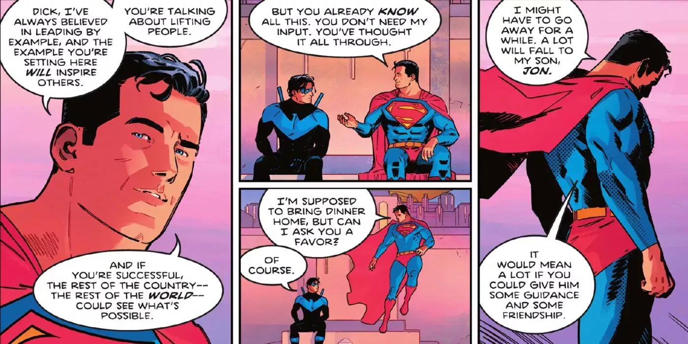 La carrera de Jon Kent como Superman ha demostrado que el joven tiene talento, pero su padre sabÃa que necesitarÃa cierta orientación. Ahà es donde entra Nightwing. Dick Grayson y Superman siempre tuvieron una relación increÃble, y no hay nadie en quien el Hombre de Acero confiara más en su hijo que en Nightwing.