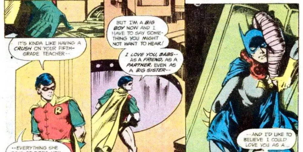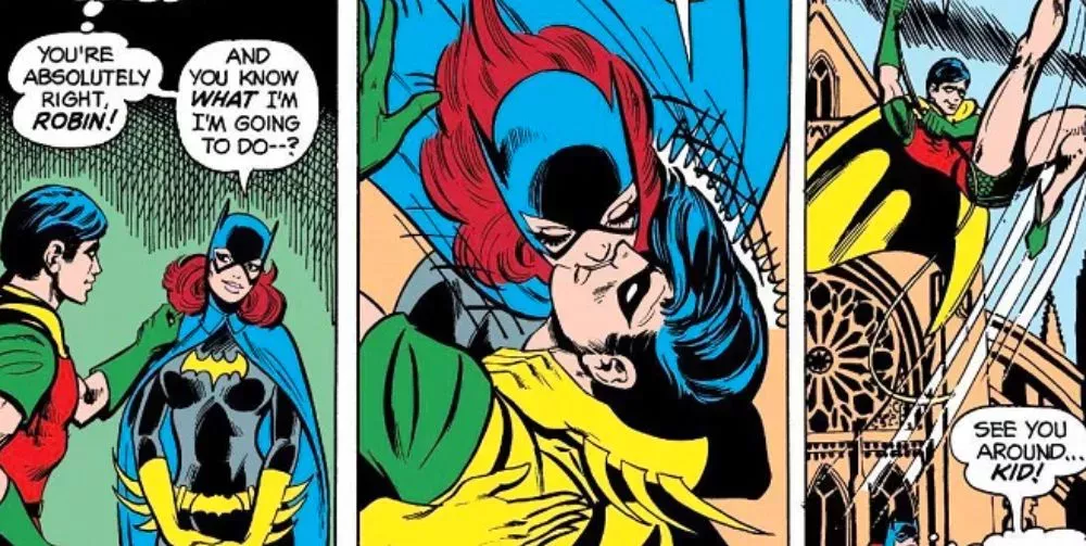 En este punto de los cómics, Barbara Gordon es una mujer adulta y Dick Grayson es todavía un adolescente, por lo que ambos se limitan a luchar juntos contra el crimen. Hay un momento en el que Batman cree que Robin está enamorado de Batgirl.
