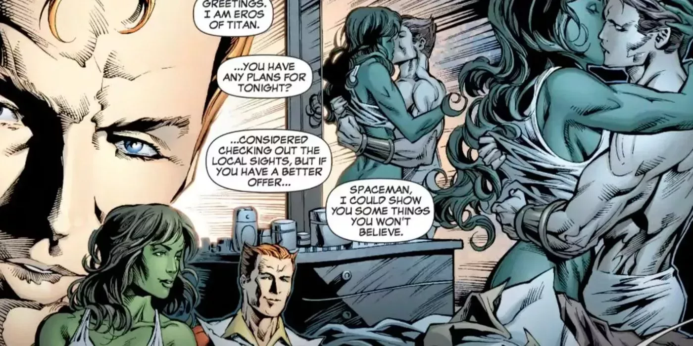 She-Hulk es conocida en todo el Universo Marvel por ser una de las solteras más codiciadas. Entre sus pretendientes se encuentran Wyatt Wingfoot, el dios del trueno asgardiano Thor e incluso el villano rival de los X-Men Juggernaut. Incluso el infame Starfox se coló en la vida de Jennifer Walter.
