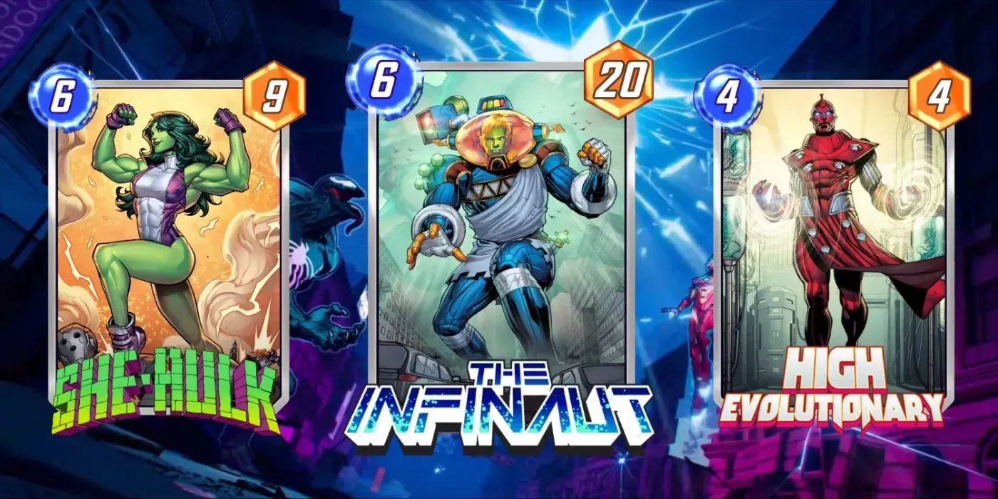La lista de mazos She-Naut existe desde hace tiempo, pero ha conocido varias formas diferentes. En todos y cada uno de los casos, She-Hulk y La Infinaut son las figuras centrales. Hacer que Magik dure 7 turnos permite al jugador hacer flotar Energía en el turno 6, lo que significa que puede jugar un She-Hulk de coste 0 junto con El Infinaut para cerrar la partida. Sin embargo, con Alto Evolucionador de por medio, esta baraja en particular tiene múltiples líneas de juego y, lo que es más importante, condiciones de victoria.
