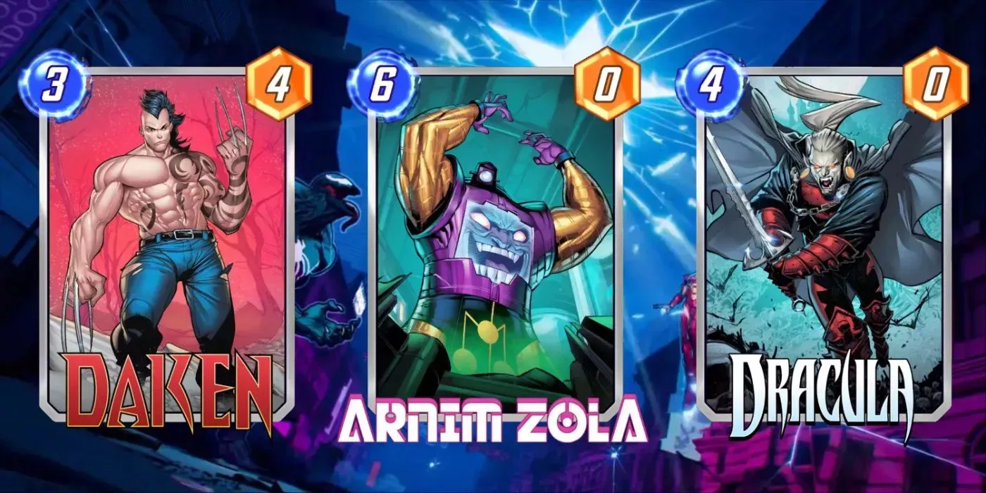 Los descartes básicos como Enjambre y Lady Sif no son necesarios en esta baraja en particular. En su lugar, las condiciones de victoria residen en que Arnim Zola golpee a Daken o a Drácula, y luego se descarte con MODOK. MODOK golpearía o bien con triples descartes de Fragmentos de Muramasa para obtener un Poder astronómico, o bien con Apocalipsis para alimentar las dos cartas de Drácula. La inclusión de Ravonna hace que Drácula, Morbius y Arnim sean aún más baratos de lo normal, mientras que Crystal, Magik y Nico Minoru ayudan a garantizar que los jugadores puedan poner en práctica al menos parte de su plan de juego.