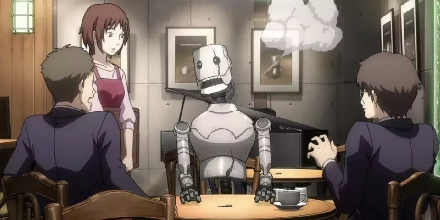 Time of Eve utiliza sus visuales para jugar con su premisa. La tecnología se anima con 3DCG, mientras que lo que se considera humano se hace con arte tradicional. La belleza del espectáculo es que se sitúa en un café que trabaja activamente contra ese binario. Dentro del café, los androides no necesitan mostrar sus halos digitales. Esto hace que sea muy difícil distinguir a los humanos de los androides.
