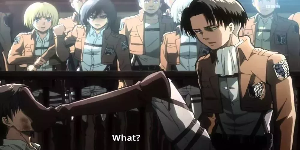 Es entonces cuando Levi interviene y, en una de sus escenas más icónicas, comienza a patear y golpear sin piedad al encadenado Eren. Es capaz de demostrar lo poderoso que es, incluso sin un arma para matar titanes, y esta actuación es suficiente para ganarse al público. Este engañoso espectáculo permite que Eren sea liberado y puesto bajo la custodia del Survey Corps.