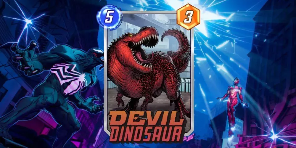 El Dinosaurio Diabólico es una de las cartas continuas más temidas de Marvel Snap. Su habilidad Ongoing le otorga +2 de Poder por cada carta que quede en la mano del jugador al final de la partida. Esta carta de 5 costes tendrá una media de 11 puntos de poder, ya que los jugadores suelen optar por otras opciones si planean jugar varias cartas en las fases posteriores.