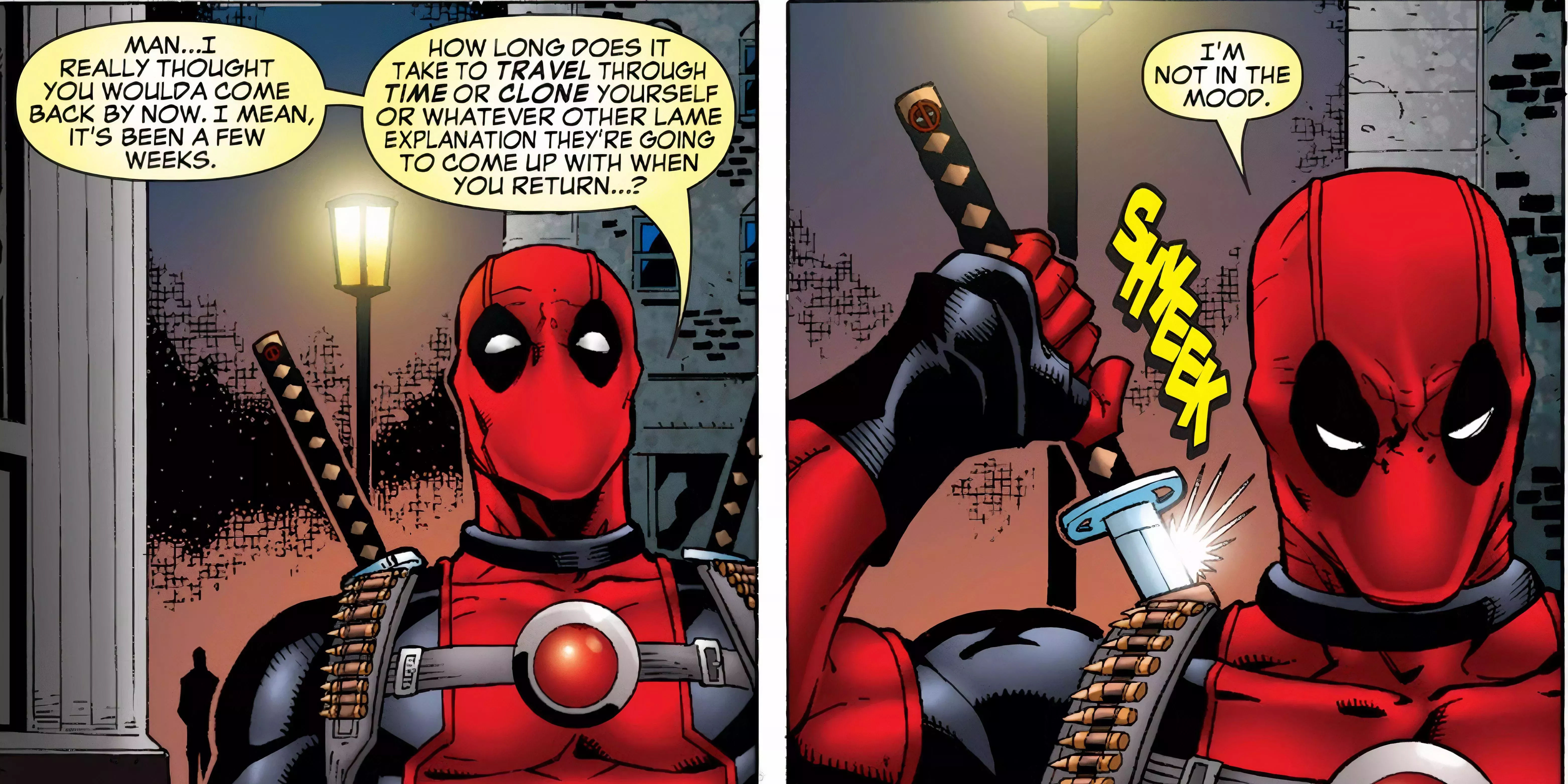 Esta historia se adentra en su compleja historia, con nostálgicas referencias a aventuras anteriores. También es una entrada particularmente humorística en el canon compartido de Deadpool y Cable, con Cable tratando de evitar que Deadpool asesine a alguien que inventa una máquina del tiempo. El hecho de que el canoso hijo de Summers persiguiera antagónicamente al Merc With a Mouth, sólo para que hicieran un viaje por el carril de los recuerdos codo con codo, proporcionó una divertida caja de arena para que los dos personajes jugaran. Otra ventaja es la introducción de Split Second, el villano titular del arco argumental, un nuevo e intrigante villano.