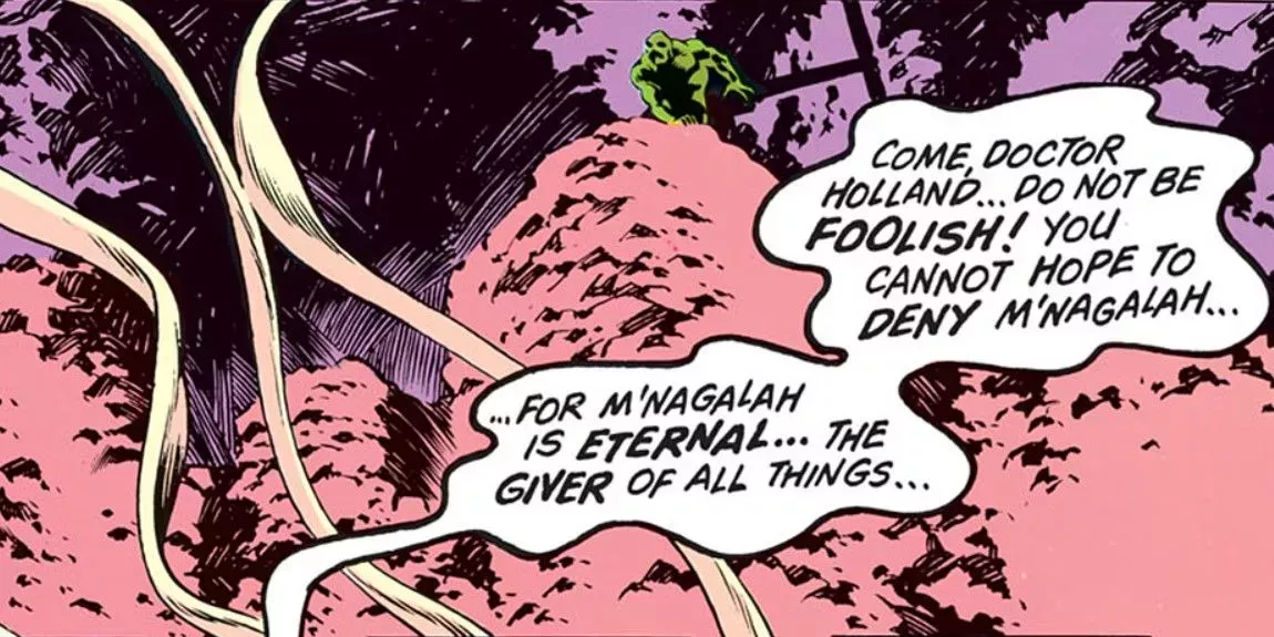 La Cosa del Pantano se encontró con M'Nagalah, un antiguo ser de inmenso poder, al estilo de los Dioses Antiguos del horror lovecraftiano. Se comunicó con la Cosa del Pantano, revelándole su antigua edad y sus nefastas intenciones. El cómic tenía un gran sentido del horror cósmico.