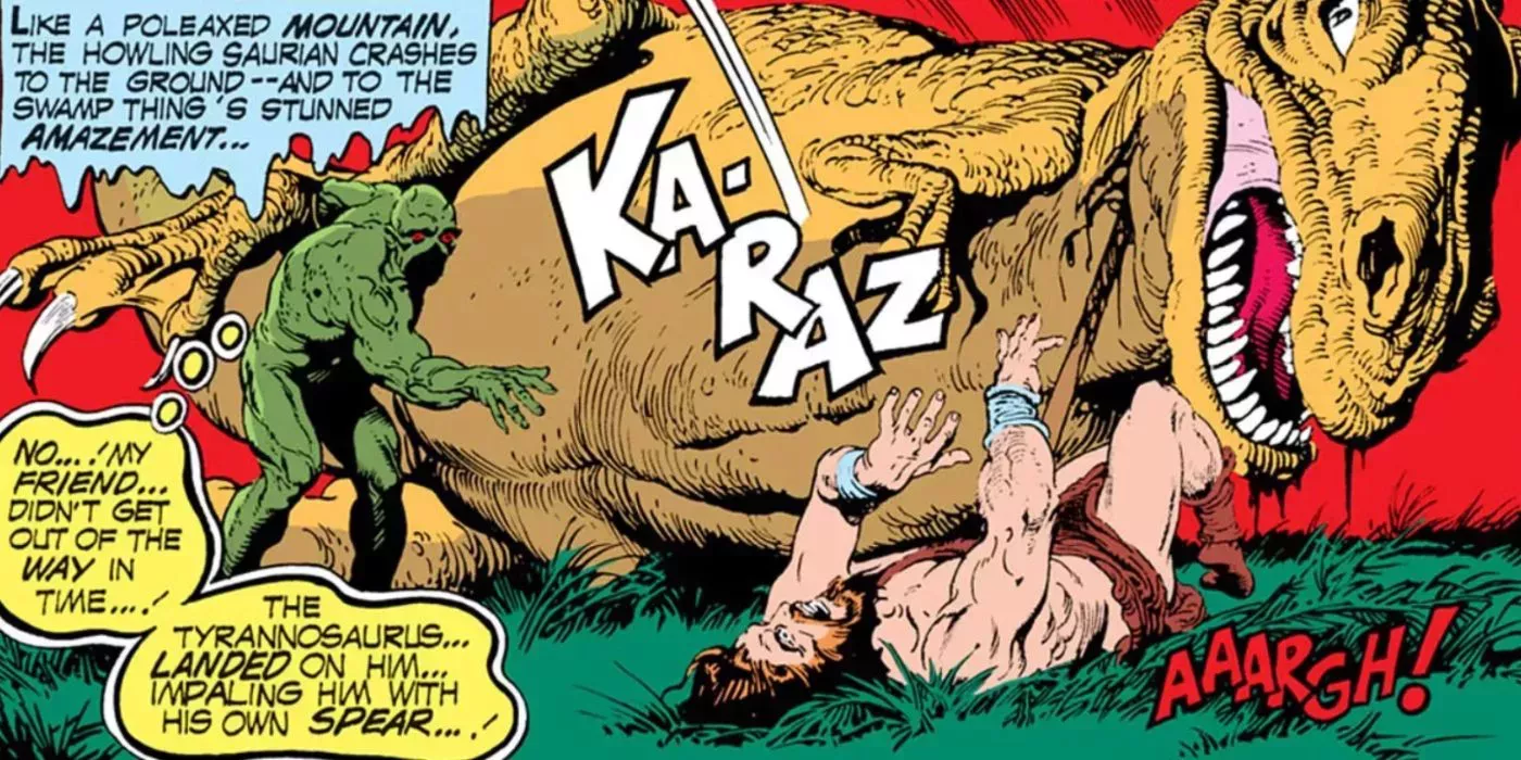 Tras su encuentro con un científico y sus monstruosos gusanos captores, la Cosa del Pantano tropezó con una misteriosa roca brillante en el pantano. Cuando intentó investigar, se vio transportado a la prehistoria, donde un hombre le salvó del ataque de un dinosaurio.