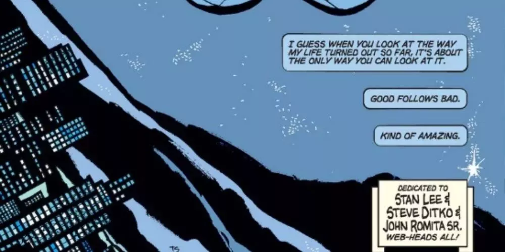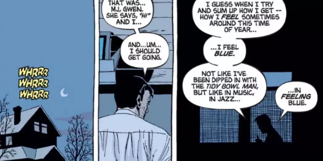 La vida de Spider-Man va de lo divertido y ligero a lo pesado y trágico. Spider-Man: Blue muestra una tragedia real, pero no deja a Peter deprimido. Hay dolor cuando se crea un vÃnculo con alguien, pero Peter no se arrepiente de haber conocido a Gwen, Harry o cualquiera de los otros.