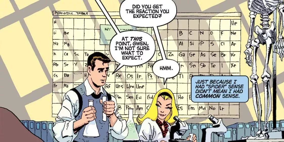 Peter reconoce que la muerte de Gwen fue peor que la del tÃo Ben, e incluso dice que Ben estarÃa de acuerdo con esa afirmación; sin embargo, no se convierte en un pensamiento triste. Es Peter dándose cuenta de lo frágil que es la vida y, en última instancia, llegando a apreciar el tiempo demasiado breve que tuvo con Gwen en su vida.