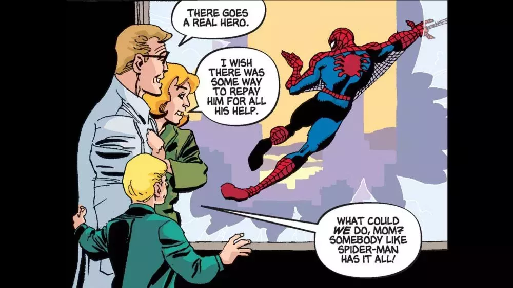 Aunque la incertidumbre recorre los pensamientos de Peter Parker durante toda la historia, hay una cosa de la que está seguro: mientras sea Spiderman, tiene que hacer lo más responsable.
