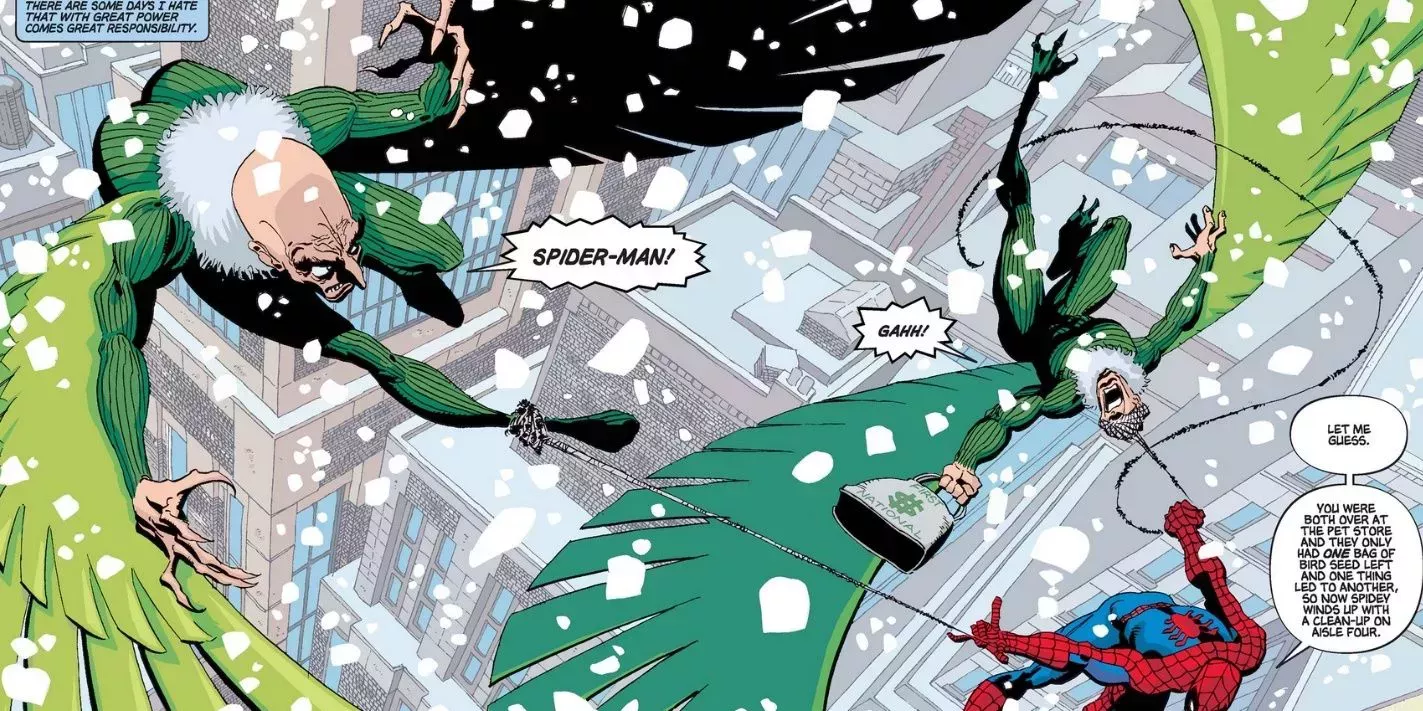 Los villanos pasan a un segundo plano mientras que los personajes secundarios están en primer plano, pero Rhino, Lagarto, Kraven e incluso dos Buitres aparecen para arruinar el dÃa de Spider-Man. En el número 5, Peter tiene que dejar su propia fiesta de inauguración para luchar contra el Buitre, y nunca cuestiona su deber, citando el adagio del tÃo Ben sobre el poder y la responsabilidad.