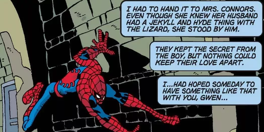 La verdadera batalla es la guerra interna de Peter, donde cada interacción que tiene con Gwen y Mary Jane golpea más fuerte que cualquier supervillano. Cuando persigue al Lagarto para que Connors vuelva con su mujer, Spiderman reflexiona sobre cómo esperaba casarse con Gwen, y todo lleva a que Peter y Gwen se enamoren el uno del otro.