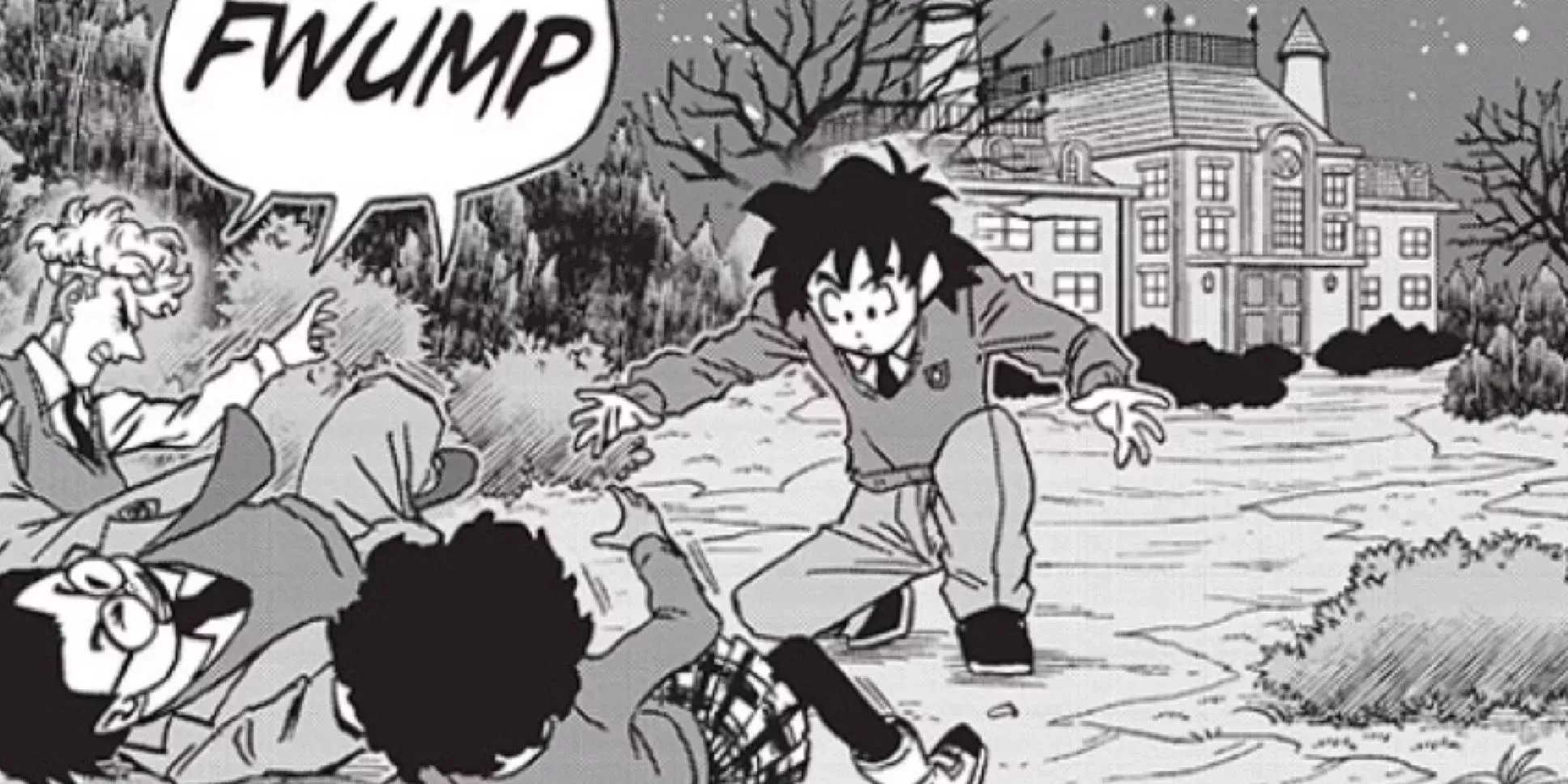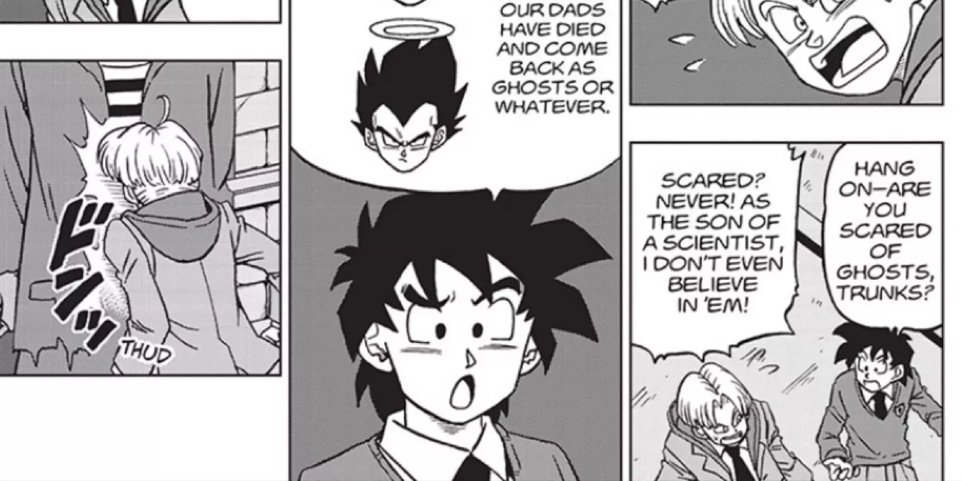 Por descabellada que sea esta explicación, de alguna manera funciona, y los chicos salen corriendo, asustados ante la perspectiva de los fantasmas. A pesar de la metedura de pata de Trunks, la habilidad de Goten para emplear la rapidez mental para acallar las sospechas de sus compañeros demuestra que es el cerebro perfecto de la nueva operación Saiyaman.