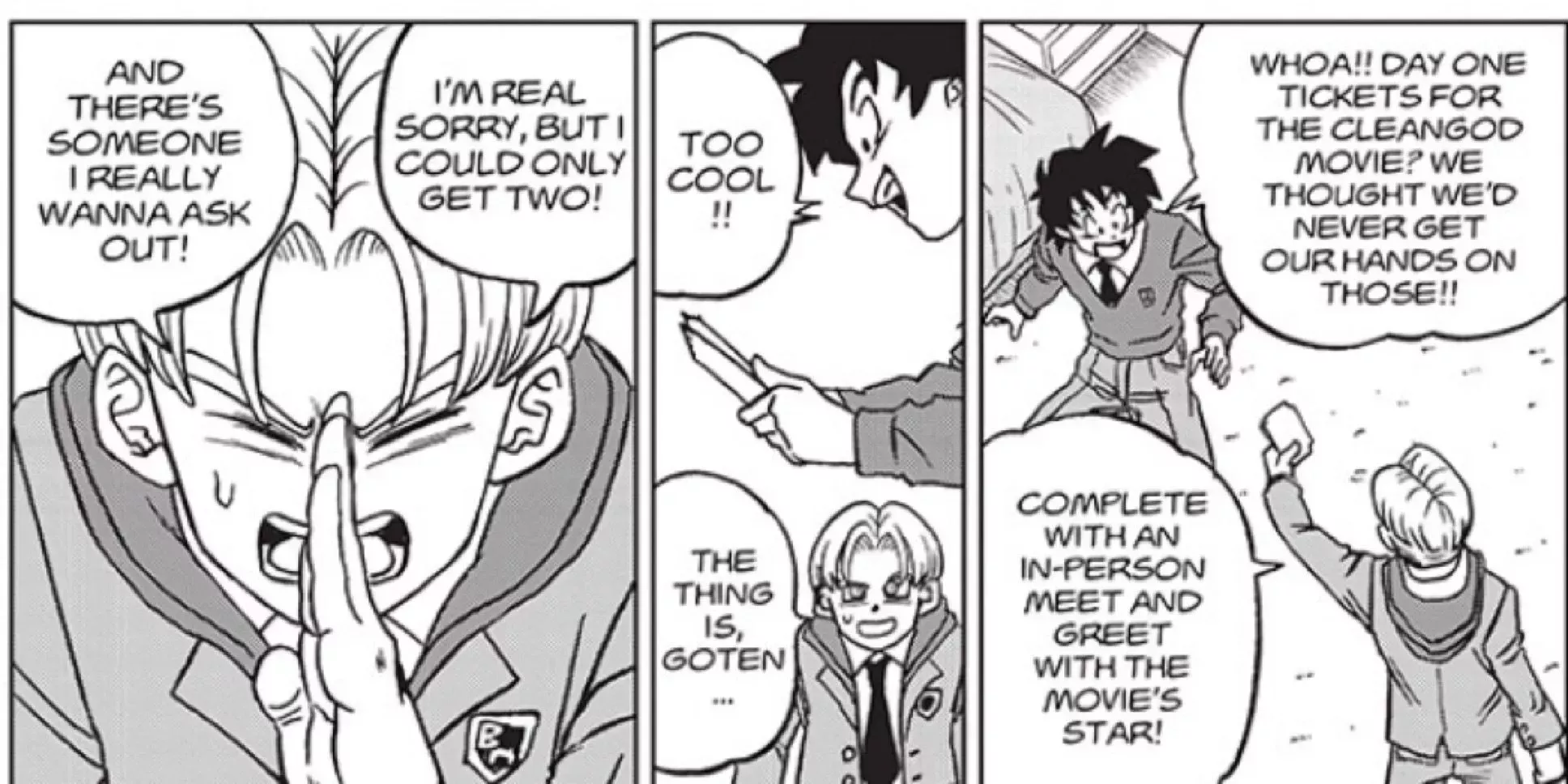 Cuando Trunks le dice a Goten que ha conseguido entradas para la nueva pelÃcula de Cleangod, Goten se emociona muchÃsimo. Después de todo, Cleangod es su personaje favorito e incluso es el modelo para su personaje de superhéroe y el de Trunks.