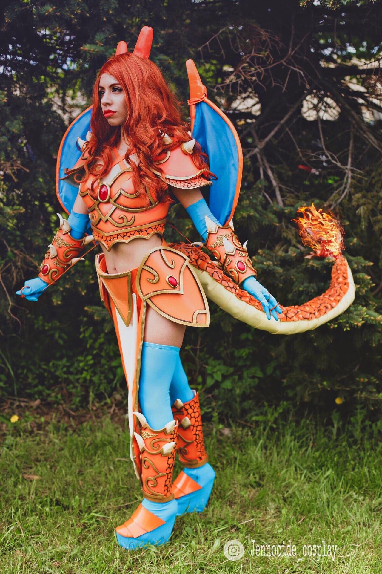 La armadura naranja y dorada bien hecha constituye la mayor parte de su atuendo, y le queda muy bien. Las alas y la cola de Charizard han sido replicadas con costuras intrincadas, y las telas utilizadas les dan un aspecto verdaderamente auténtico. Rematado con medias azul claro, botas con cuernos y pelo carmesí, es uno de los mejores cosplays Pokémon del mundo.