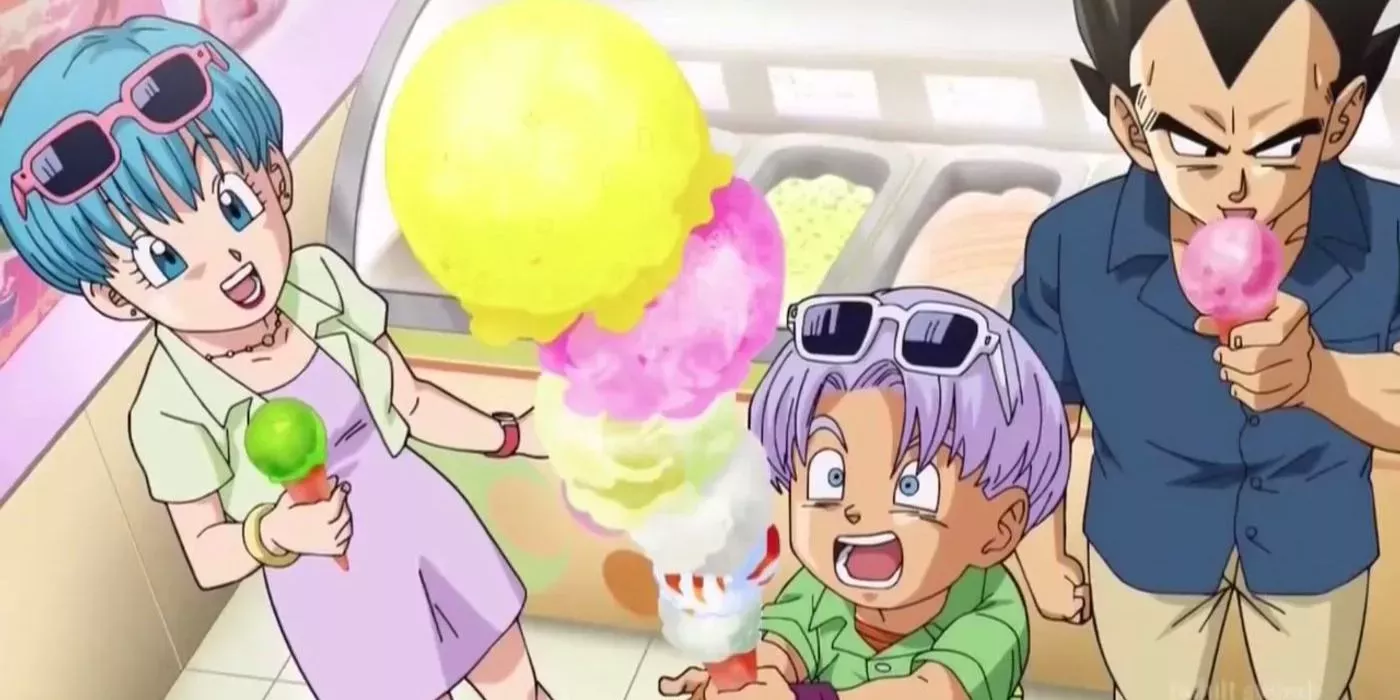 Dragon Ball Super comienza durante una época de paz y la serie muestra a sus personajes durante los escasos momentos de descanso antes de que el peligro vuelva a asaltarlos. Resulta increíblemente encantador ver que Bulma y Vegeta se han llevado a su hijo Trunks de vacaciones. Bulma parece pasárselo en grande durante esta excursión, ya sea en tranquilos paseos con su familia o degustando deliciosos tentempiés.