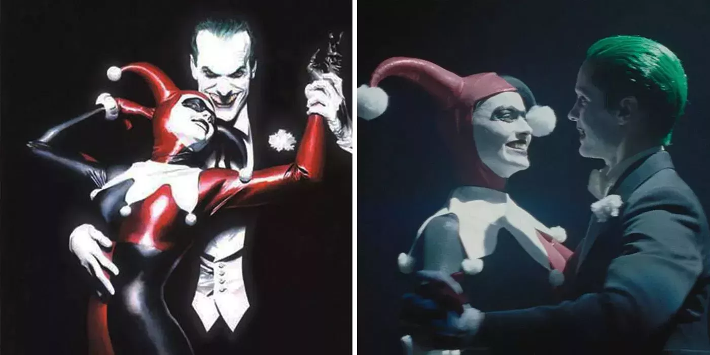 Cierto flashback muestra al Joker en esmoquin mientras Harley se apoya en él. Se trata de una clara recreación de una pintura del artista superestrella Alex Ross. Se asocia principalmente con la historia The Batman Adventures: Mad Love, ambientada en el Universo Animado de DC. El uso de la imagen celebró la primera adaptación a imagen real de su romance.