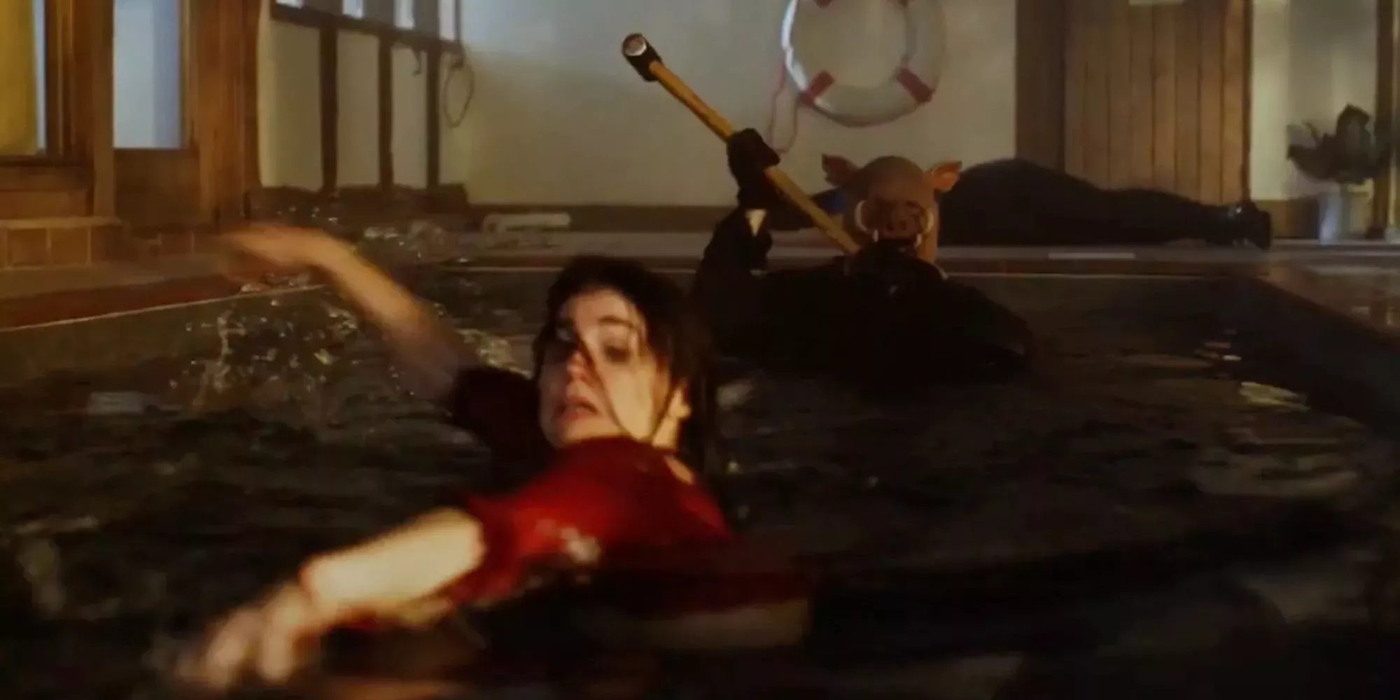 Después de que Pooh y Piglet se infiltren en la cabaña donde se aloja el grupo de amigos, Alice y Zoe salen corriendo y acaban en la sala de la piscina. Después de que Piglet noquee a Alice, Zoe cae a la piscina e intenta desesperadamente correr en el agua para escapar de Piglet, que va armado con un mazo.