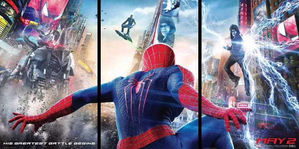 Uno de los pósteres más notables de Spider-Man es el de The Amazing Spider-Man 2. El póster de la película muestra a Spider-Man enfrentándose a tres villanos en Times Square: Electro, Rhino y el Duende Verde.
