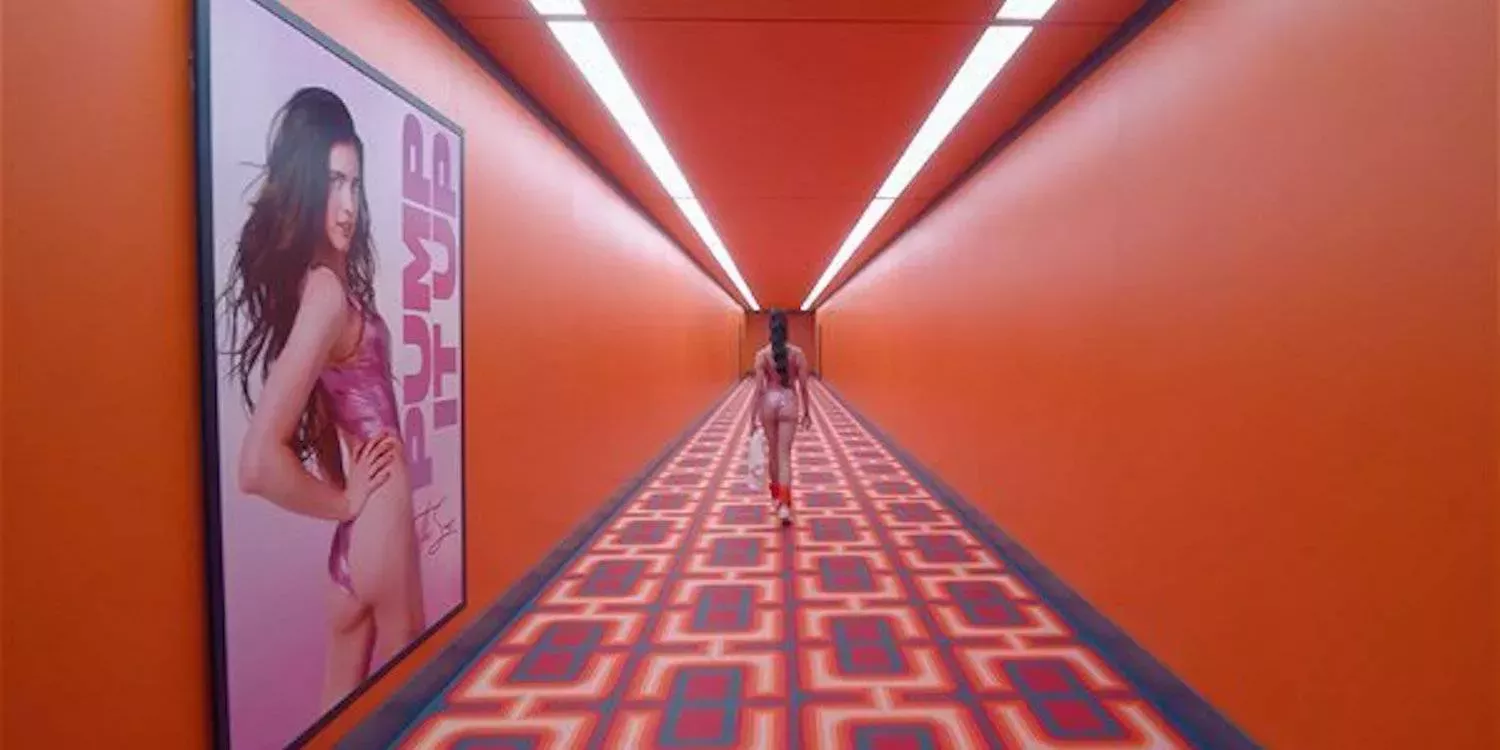 La escenografía de The Substance tiene muchas metáforas interesantes, y ciertos cambios en determinadas localizaciones expresan los mundos internos de los personajes, eliminando la necesidad de diálogos. El pasillo naranja, en particular, representa la visión que tiene Elisabeth de la historia de su propia vida. Al principio, Elisabeth camina por el pasillo después de rodar. Representa literalmente todos sus grandes logros, en retratos de los hitos de su carrera a lo largo de los años en las paredes.