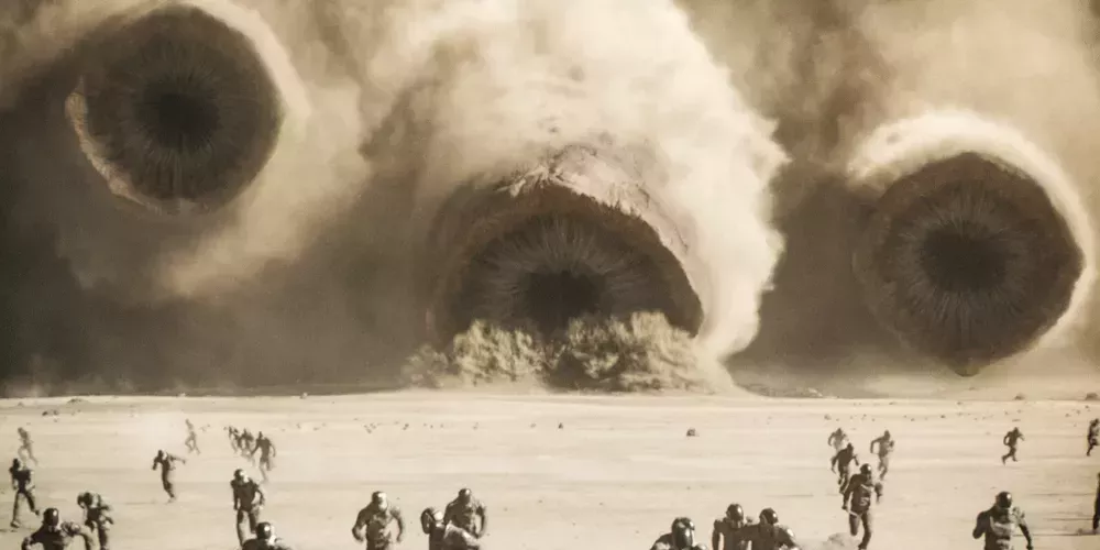 Dune: Segunda Parte presenta una escena monumental en la que tres Gusanos de Arena se precipitan por las arenas del desierto uno al lado del otro. El tamaño de los gusanos y el hecho de que avancen con sus bocas gigantes y abiertas es suficiente para aterrorizar a cualquiera, pero no a los Fremen. En lugar de huir de ellos, los utilizan como medio de transporte. Todo el grupo sube a lomos de estos tres gusanos para dirigirse hacia el sur.