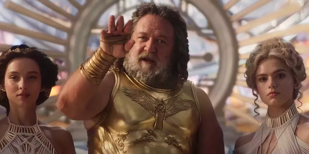 Probablemente, el momento más divertido de la película tiene lugar en la Ciudad de la Omnipotencia. Después de que Zeus descubra a Thor y a su equipo haciéndose pasar por otros dioses, obliga a Thor a enfrentarse a él. Para quitarle la túnica, el dios olímpico mueve su dedo con su magia, lo que deja a Thor completamente desnudo.