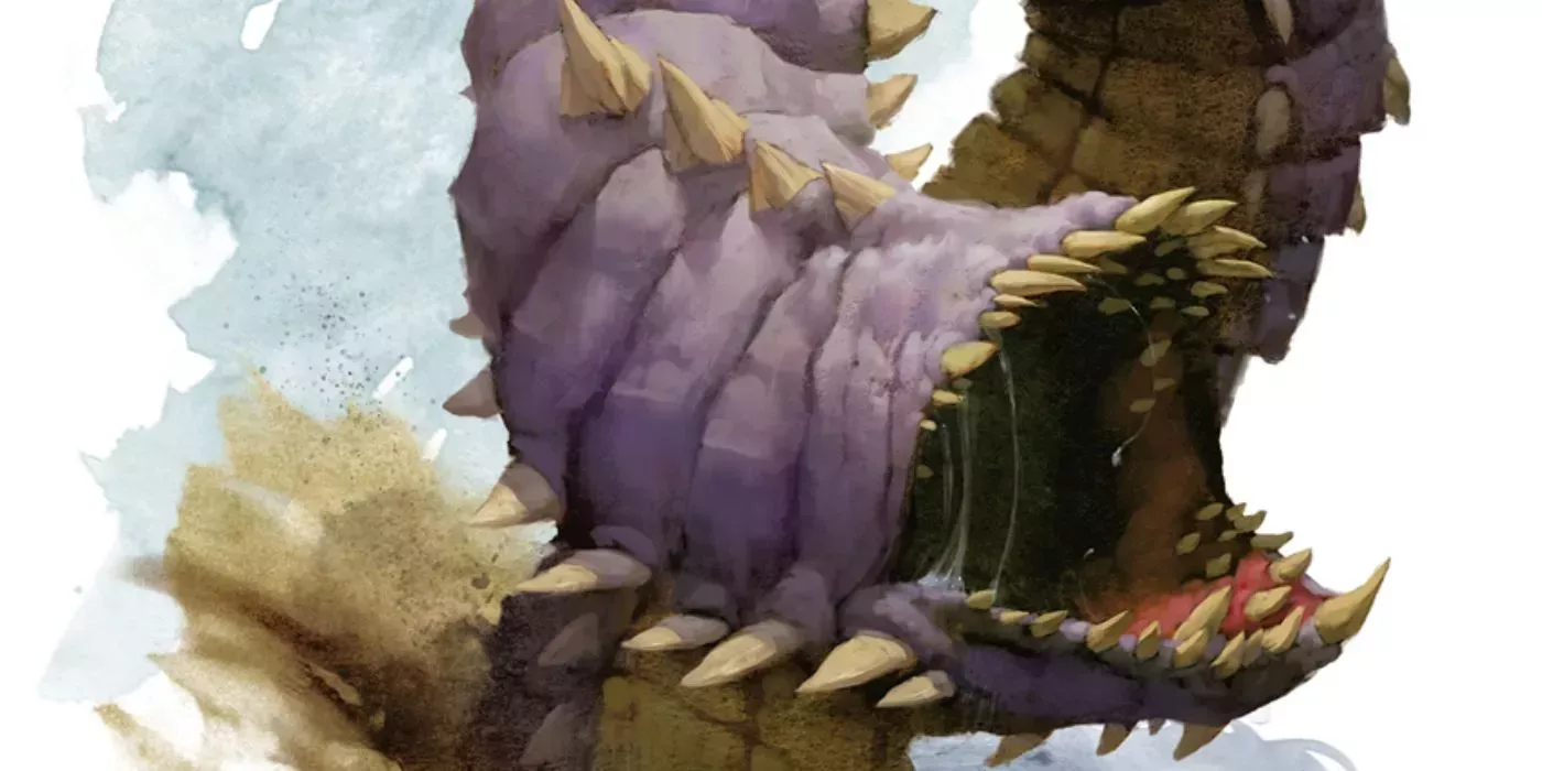 Los gusanos púrpura son la versión de D&D de los grandes gusanos de arena de Dune , criaturas gigantes con armadura que excavan en lo profundo del desierto y a veces aparecen para comer lo que les quepa en la boca. Los gusanos púrpura son duros en una pelea, pero en una aventura en el desierto, también son excelentes amenazas ambientales.