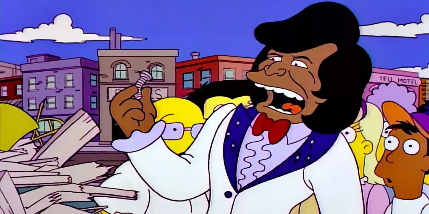 El padrino del soul interpreta su canción de 1965, I Got You (I Feel Good), antes de que el escenario se derrumbe y la banda caiga al suelo. James Brown descubre cómicamente la raíz del problema con su icónica voz.