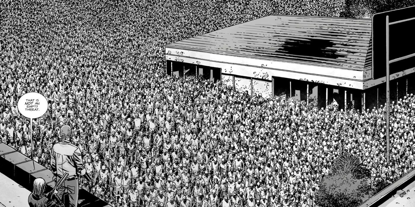 Los humanos se convirtieron en los principales antagonistas de la mayor parte de la serie The Walking Dead después de los primeros volúmenes. La mayoría de ellos eran interesantes, pero parecía que los zombis eran secundarios. El número 82 cambió eso de forma importante cuando una manada masiva de muertos vivientes se abrió paso dentro de Alexandria, obligando a todo el asentamiento a esconderse en el interior.