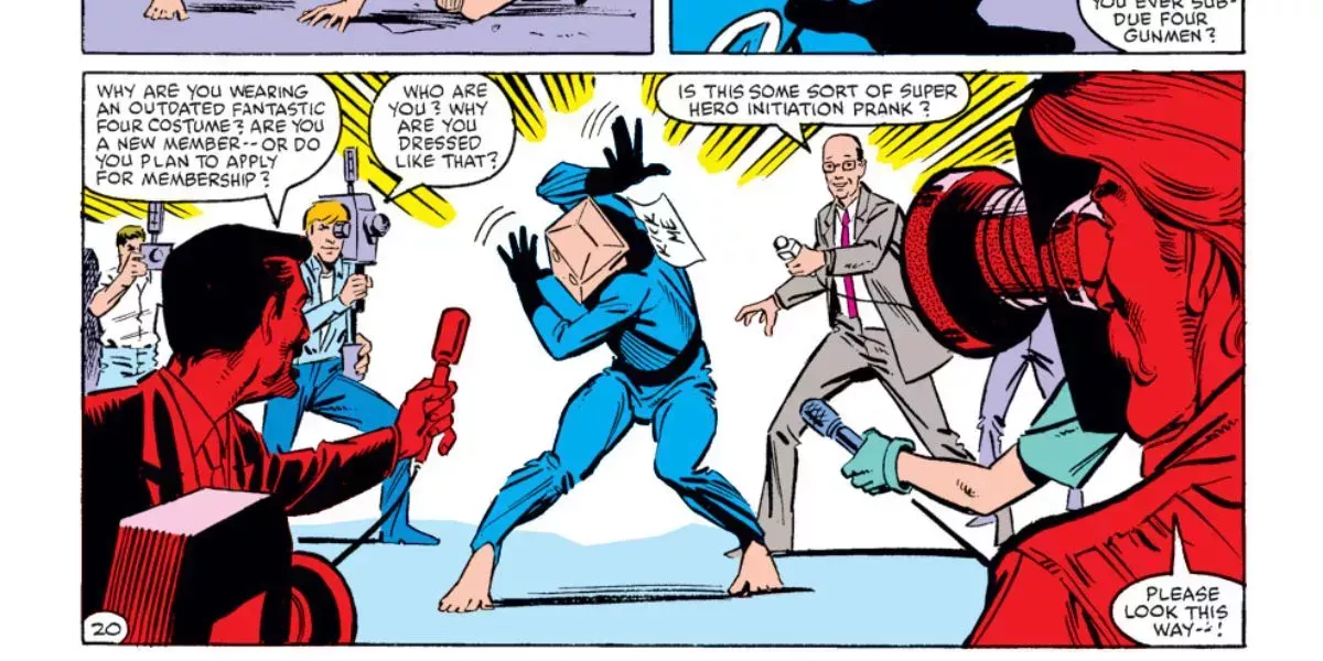 Un momento graciosamente incómodo se muestra en The Amazing Spider-Man #258, por Tom DeFalco, Ron Frenz, Josef Rubinstein y Bob Sharen, cuando Spider-Man se quita su traje de simbionte y tiene que vestirse con un viejo uniforme de los Cuatro Fantásticos y llevar una bolsa de papel en lugar de una máscara. En un panel en particular, un grupo de reporteros toma fotos de Spiderman con esta peculiar vestimenta; es uno de los momentos más vergonzosos de Spiderman, y por la suerte de los Parker, se muestra para que lo vean millones de personas en la televisión.