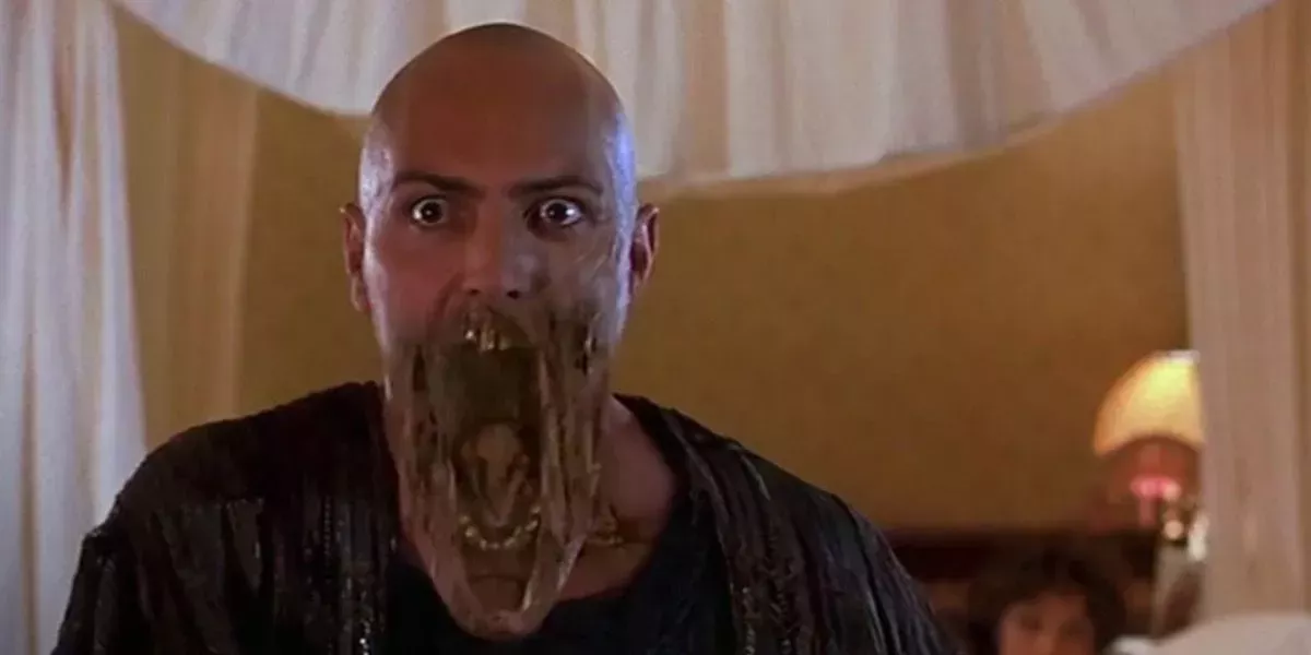 El villano principal de La momia, el recién resucitado Imhotep, comienza su alboroto como un horrible monstruo descompuesto que drena la fuerza vital de aquellos que han sido maldecidos por él. La película no es lo bastante sangrienta como para merecer una calificación para adultos, pero sí que va lo suficientemente lejos como para hacerla realmente espeluznante, sobre todo con sus enjambres de escarabajos.