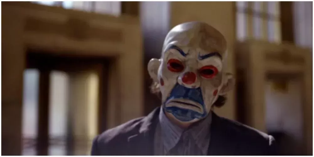 Los atracadores llevan máscaras de payaso de plástico, un homenaje a su cabecilla y a la película The Killing de Stanley Kubrick . Los ladrones se van eliminando uno a uno, motivados por la promesa de más dinero. Al final, sólo queda el Joker. Como el resto de El Caballero Oscuro, el comienzo es sorprendentemente divertido.