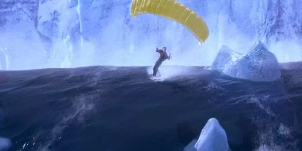 Tras verse obligado a salir de un glaciar, Bond se eleva sobre una enorme ola de tsunami surfeando con sólo un paracaídas y un poco de metal. Así es, surfea como un profesional sobre una enorme ola de tsunami sin una tabla de surf adecuada y esquivando glaciares de hielo mientras avanza. Eso es realmente impresionante incluso para James Bond y con el horrible CGI, sólo deja un mal sabor de boca a los fans.
