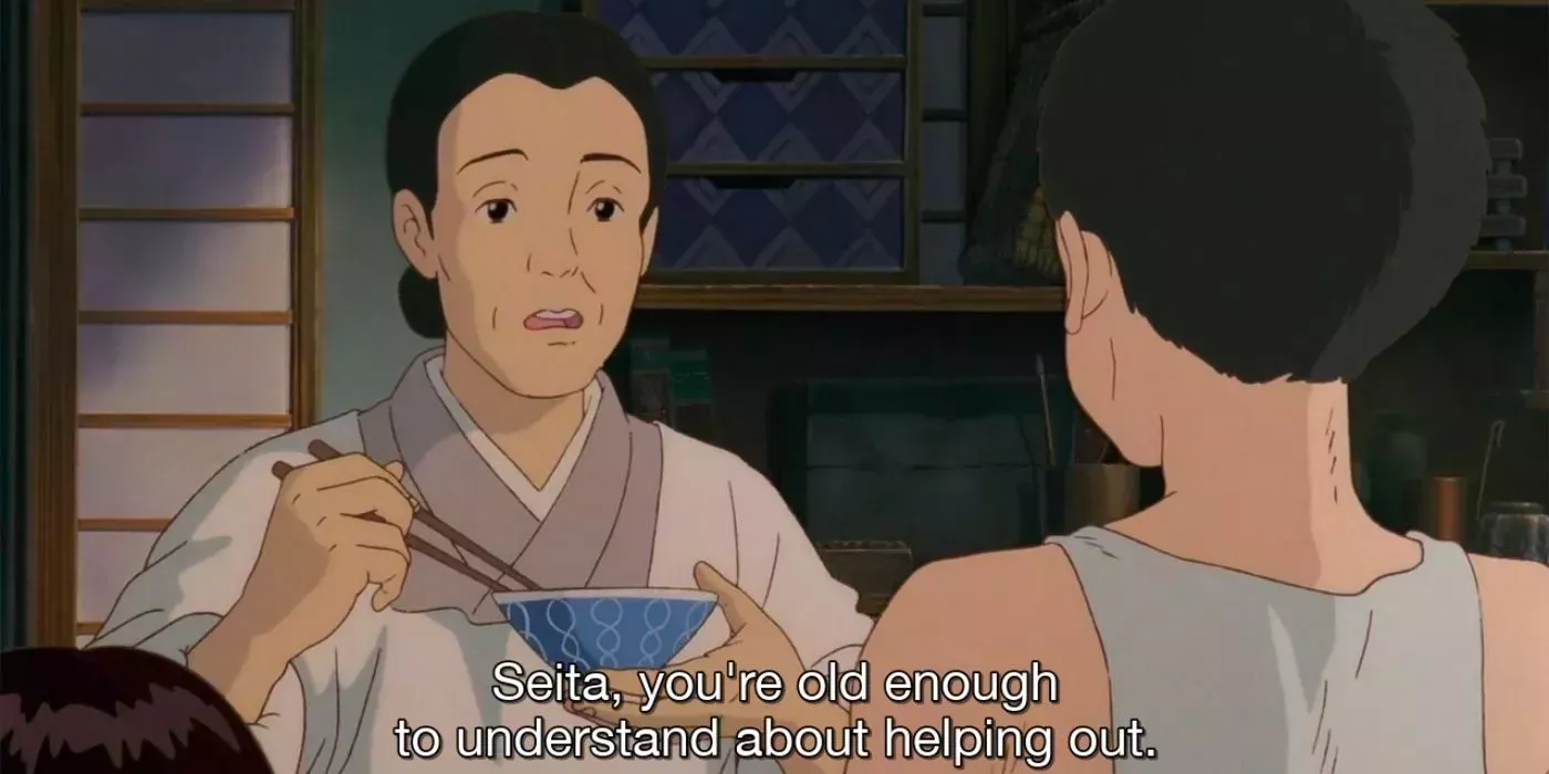 La tumba de las luciérnagas es posiblemente la película más desgarradora de Ghibli. Seita intenta mantenerse con vida no sólo a sí mismo sino también a su hermana pequeña durante la Segunda Guerra Mundial. Un aspecto que parece injustificadamente duro para Seita y su hermana es la época en la que viven con su tía. Aunque al principio ella parece estar de acuerdo con que los hermanos vivan con ella, pronto se vuelve resentida y dura con Seita y su hermana.