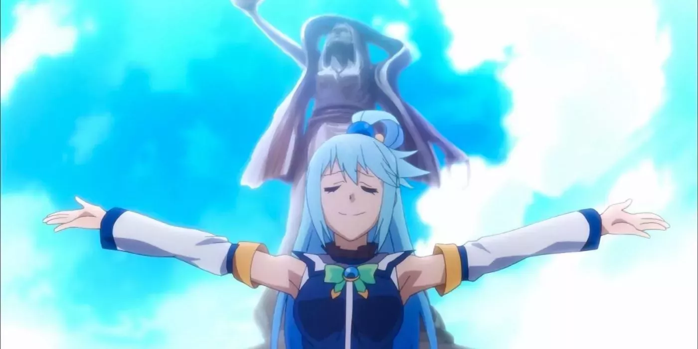Aquade Konosuba es una diosa que se vio obligada a descender a un mundo mortal. Le costó adaptarse a los cambios en sus habilidades mágicas. Con ello llegaron muchos momentos de debilidad, asà como momentos de fuerza recién descubiertos.