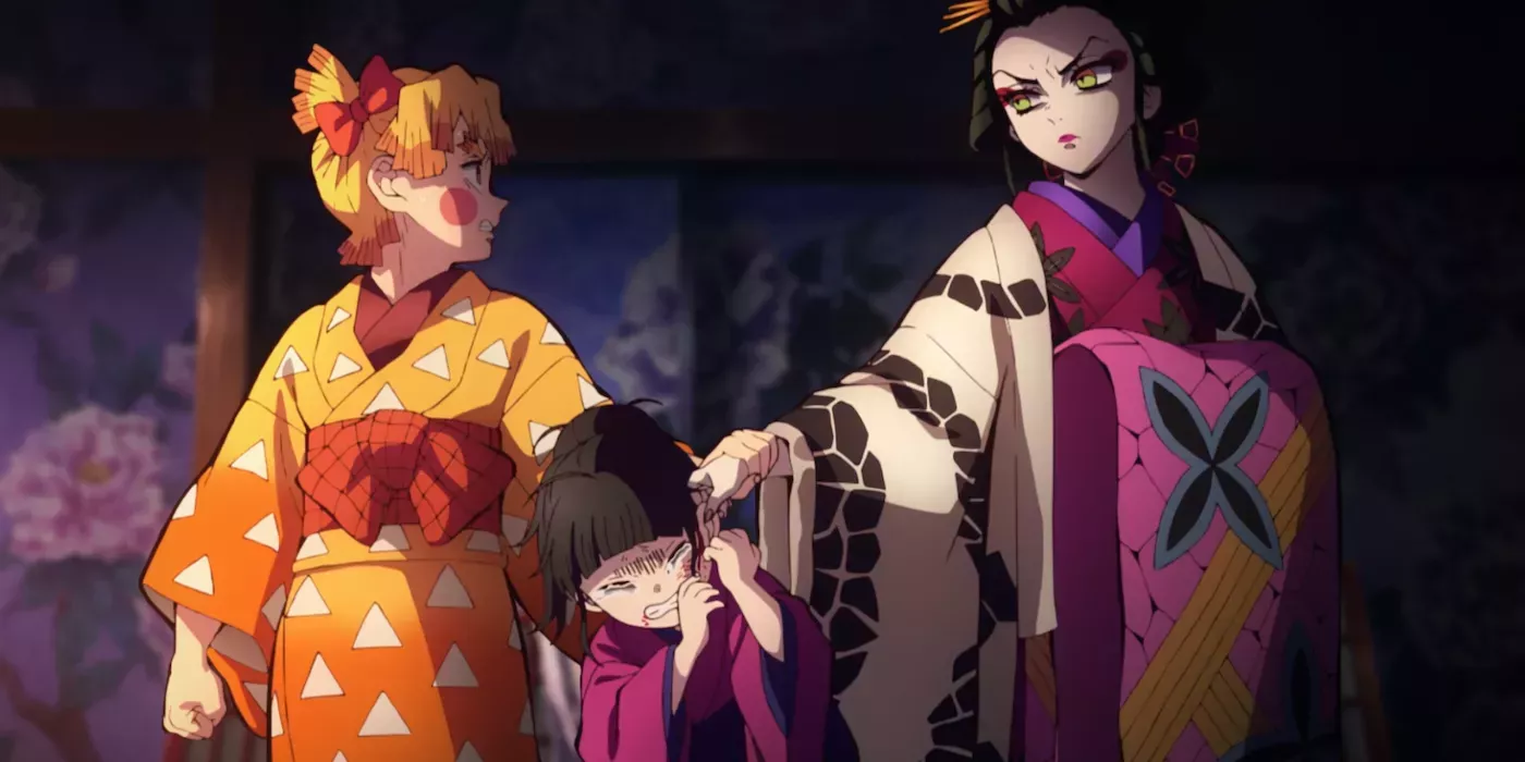 Zenitsu tropieza accidentalmente con la habitación del demonio Daki en el arco del "Distrito del Entretenimiento" después de rastrear el sonido de una niña llorando. El intento de Zenitsu de consolar a uno de los asistentes de Daki hace que éste identifique a Daki como demonio por el sonido de su voz mientras lo interroga. Su descubrimiento y su desafío a Daki evitan que el asistente sufra más heridas a manos de Daki.
