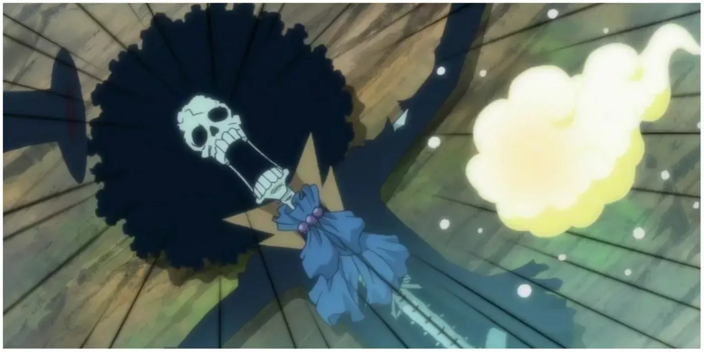 One Piece no falla cuando se trata de una triste historia de fondo para sus personajes. La tripulación original de Brook, los piratas de Rumbar, era una tripulación llena de músicos. Mientras Brook canta, un flashback muestra a los piratas Rumbar muriendo uno a uno mientras cantan "Bink's Sake" como despedida final.