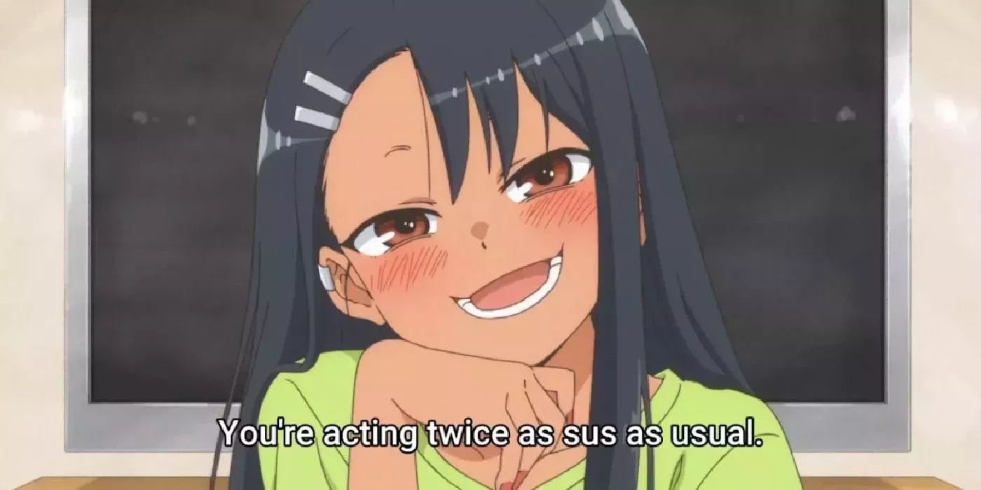 En el primer episodio localizado de Don't Toy With Me, Miss Nagatoro, Nagatoro se burló de Senpai diciendo que estaba actuando "sus". "Sus", por supuesto, es la abreviatura de "sospechoso" que muchos asumen que proviene de un popular meme de Among Us . El uso de "sus" en los subtítulos de Nagatoro fue generalmente reído o ignorado, pero también enfureció de alguna manera a la gente más allá de lo razonable.