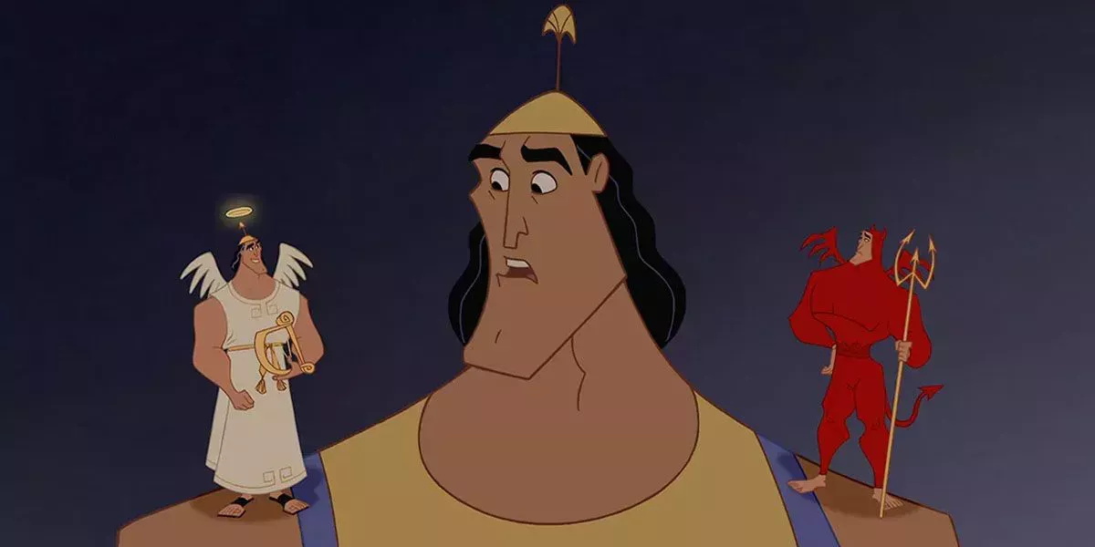 Cada vez que Kronk se enfrenta a un dilema moral en The Emperor's New Groove, habla con las versiones de ángel y demonio de sí mismo que están sobre sus hombros. Ambas partes intentan exponer su caso, y Kronk siempre deja lo que está haciendo para escucharles. Este hábito suyo es la razón por la que decidió salvar a Kuzco. Durante un momento clave del clímax de New Groove, los protagonistas tuvieron que quedarse mirando cómo conversaba con gente invisible. Yzma perdió completamente la paciencia con él después de ver esto.