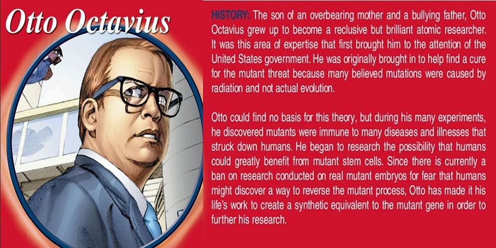 Eso no fue todo para el científico. Comprendió que los mutantes tenían un sistema inmunológico increíble. Decidió investigarlo incluso sin sus células madre vivas de especímenes del HomoSuperior . Tal vez, como Pym, Otto estaba tratando de desarrollar algo para una raza moribunda.