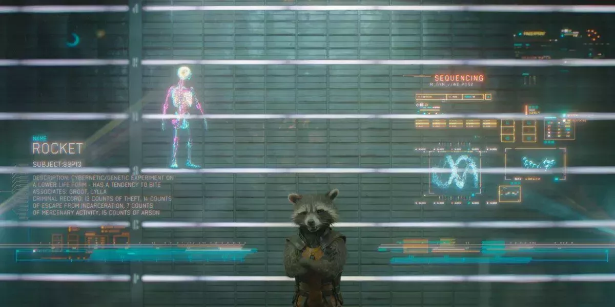 Rocket ha sufrido mucho durante su corta vida. Es un mapache de un metro de altura modificado genéticamente que, tras la experimentación, puede hablar. El sufrimiento interno de Rocket hace que a menudo actúe con rabia, y nunca quiere ser visto como débil. Al principio, su dolor es su motor, pero finalmente, la protección de aquellos a los que Rocket llega a querer le empuja a seguir adelante.