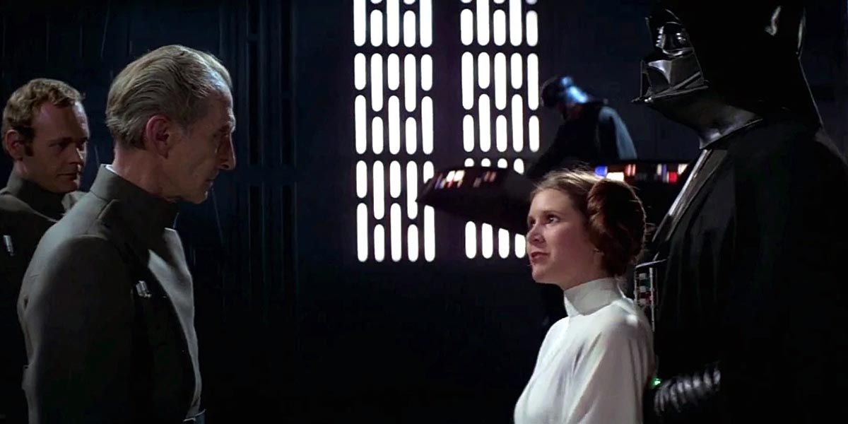 Cuando se encuentran por primera vez en Una nueva esperanza, Vader conoce a una joven que, al ser capturada y torturada por el Imperio, se niega a darles la información que quieren. Leia se mantiene firme en sus creencias y se niega a ceder ante el Imperio, y aunque eso le causa muchos problemas a Darth Vader, éste no puede evitar sentirse impresionado por su fortaleza.