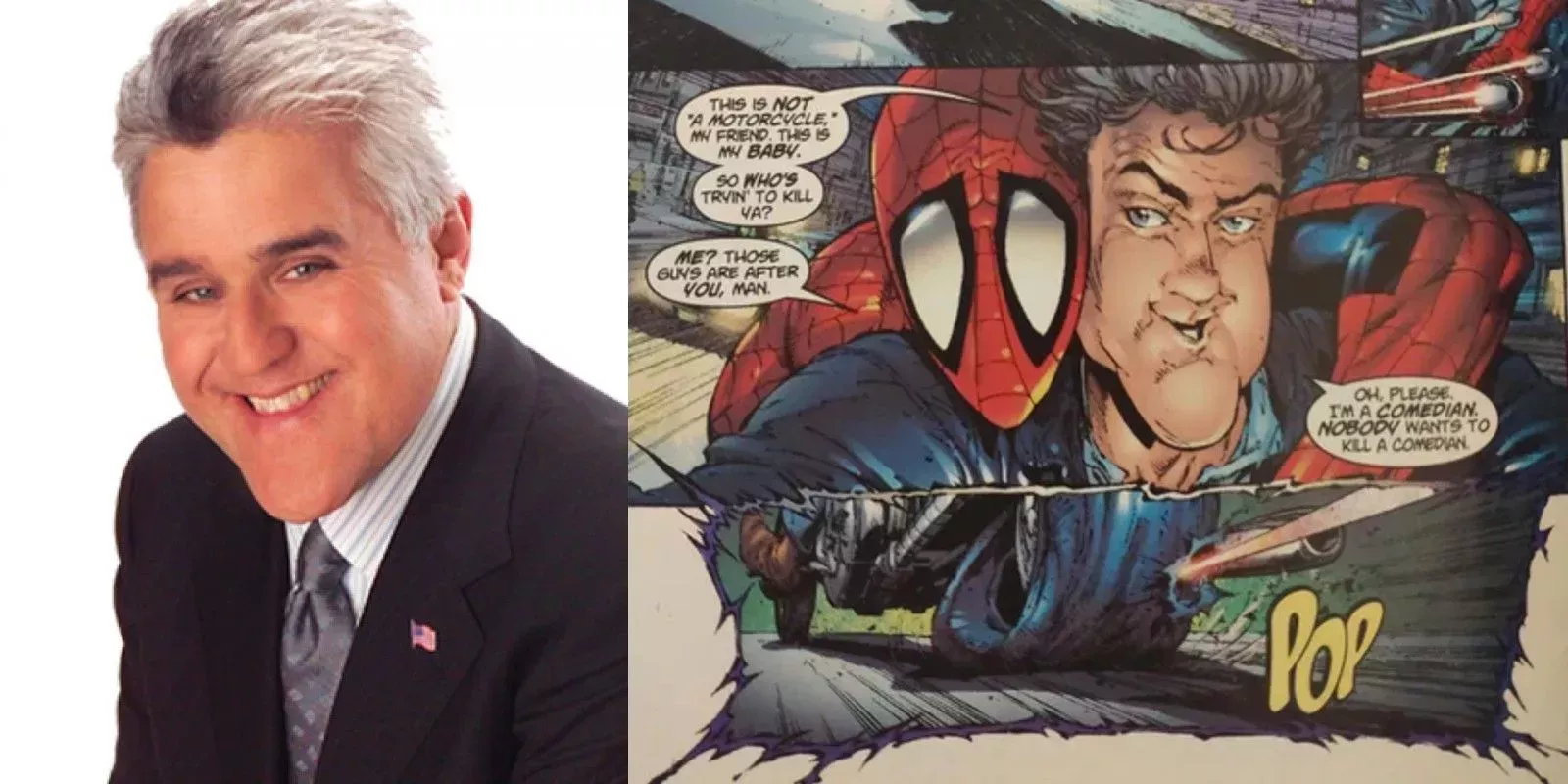 Jay Leno puede haber hecho más apariciones en los cómics de Marvel que cualquier otra persona real. El que fuera presentador de The Tonight Show ha aparecido en varios tÃtulos de Marvel a lo largo de los años, empezando por Amazing Spider-Man#332 de David Michelinie y Erik Larsen, donde Jay Leno es un invitado especial en un evento benéfico al que también asiste Spider-Man. Desde entonces, Leno ha aparecido en Incredible Hulk, Iron Man, e incluso se unió a Spider-Man en la historia de tres partes "¡Sólo una noche! (No te olvides de dar propina a tu camarera)".